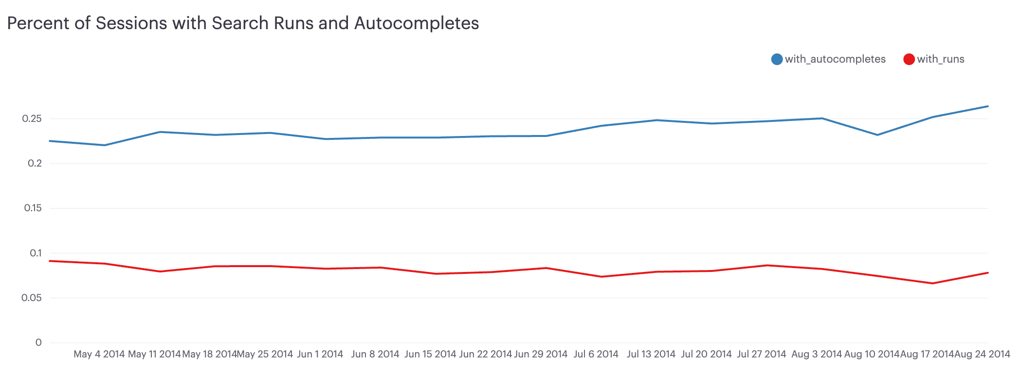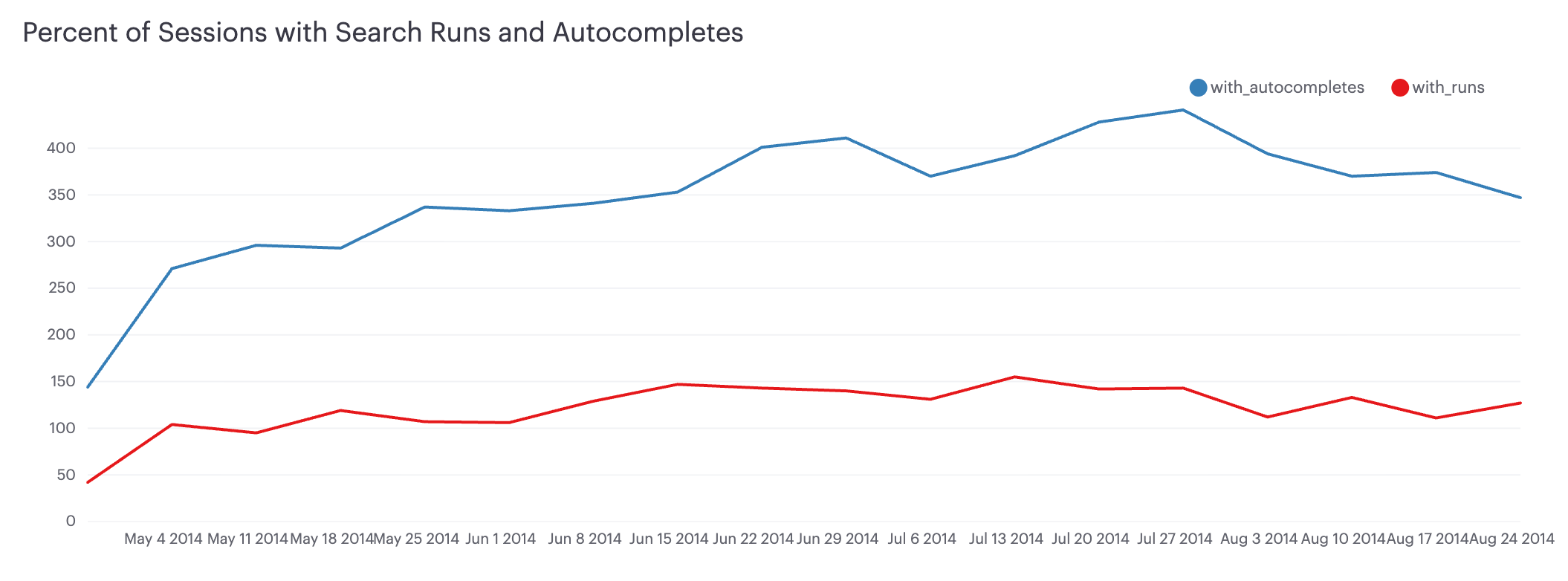 1. First, take a look at how often people search and whether that changes over time. Users take advantage of the autocomplete function more frequently than they actually run searches that take them to the search results page: